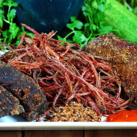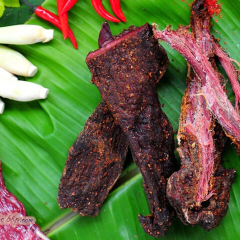 Với qui trình sản xuất hoàn toàn thủ công, thịt được lựa chọn kỹ càng, từng thớ thịt được cắt thành từng miếng dọc thớ dài từ 10 – 15cm, dầy 1,5 – 2cm, ướp với tiêu ớt và các loại gia vị tự nhiên truyền thống, sau đó dùng que tre xiên vào treo lên gác bếp trên giàn than củi nóng hong cho khô dần.